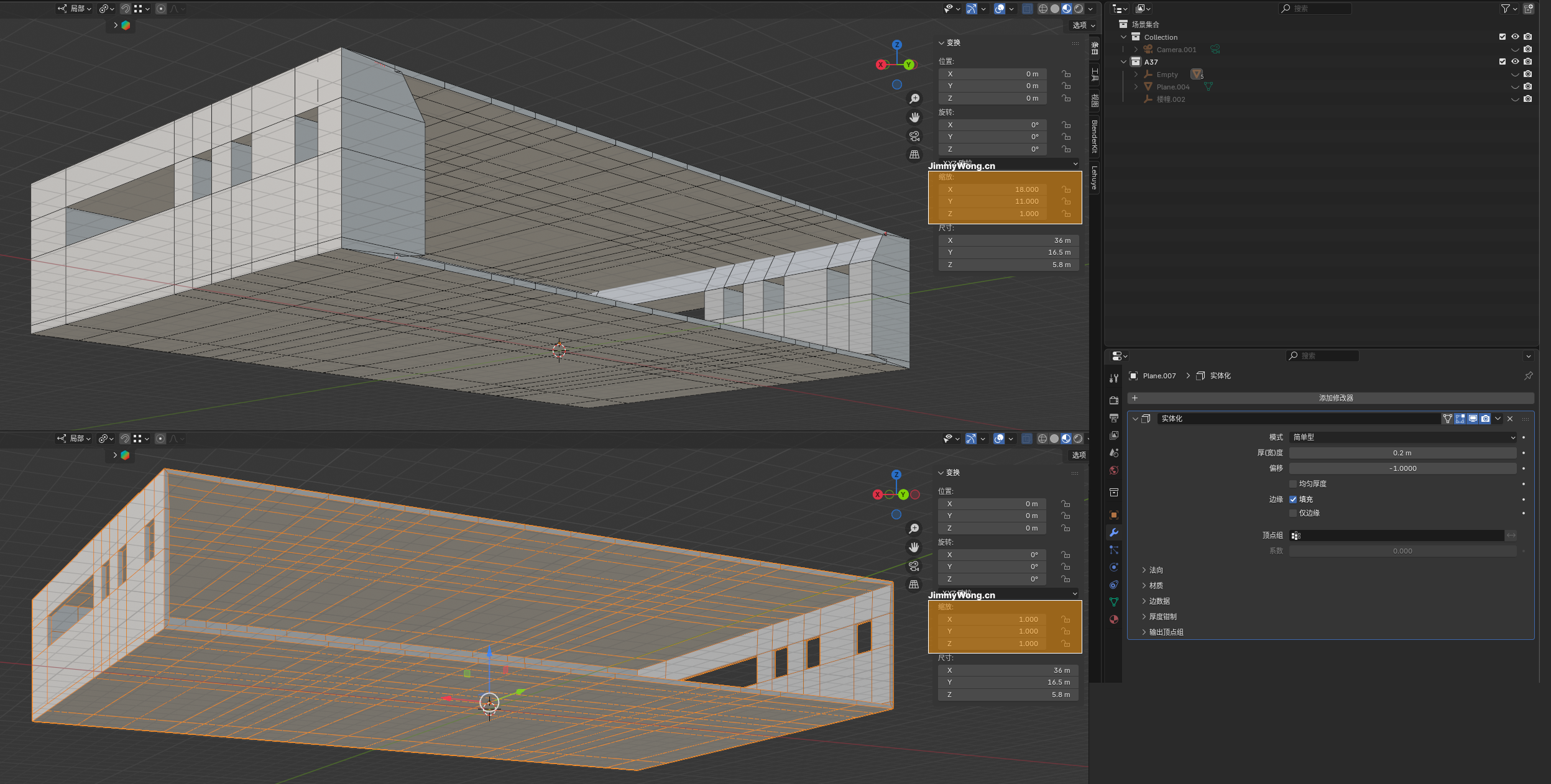 【实体化】就是将一个【平面】转换为【三维实体】,这个就节省了我们对【模型】进行【挤出】等操作,需要主要的是【实体化】是一个比较基础的逻辑,一般使用在【二维平面】和一些简单的【三维】上,如果过于复制,比如有【缕空】或是多个层面时,不太建议使用该功能,太多复杂的对象,会产生错乱,主要应用在【二维平面】上为主,复杂的对象造成【实体】的错乱是比较难以控制的。更多的用在单面墙,玻璃等的【厚度】统一上。