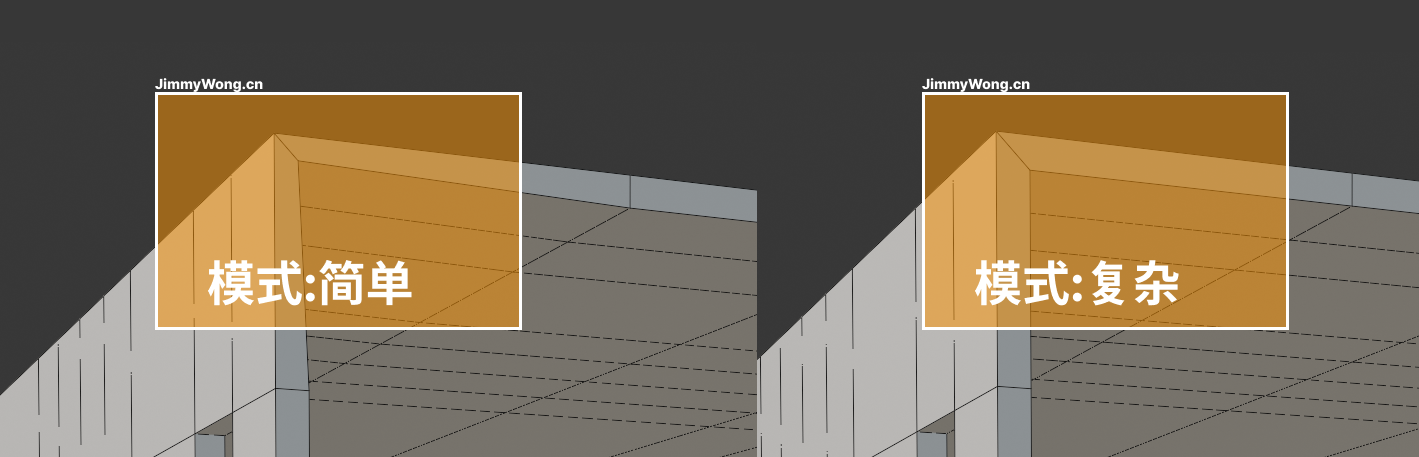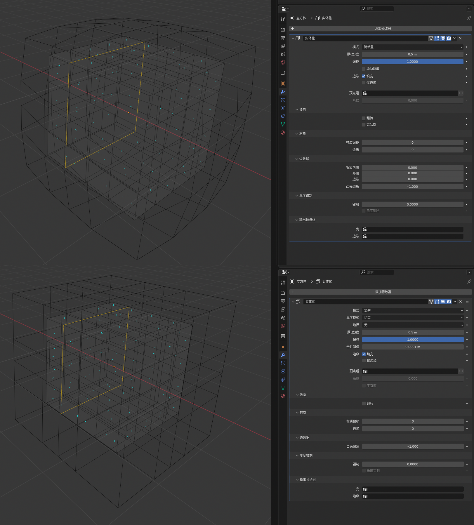 在使用三维【实体化】修改器时需要将模式选择为【复杂】,【偏移】是指【厚度】朝哪个方向进行【缩放】,【正数】是向外,【负数】是向内。在【实体化】修改器中,主要参数【模式】及【厚度】【偏移】这三个参数是比较常用的,也基本是他们起到关键作用,其它的【属性】参数一般作用不大。