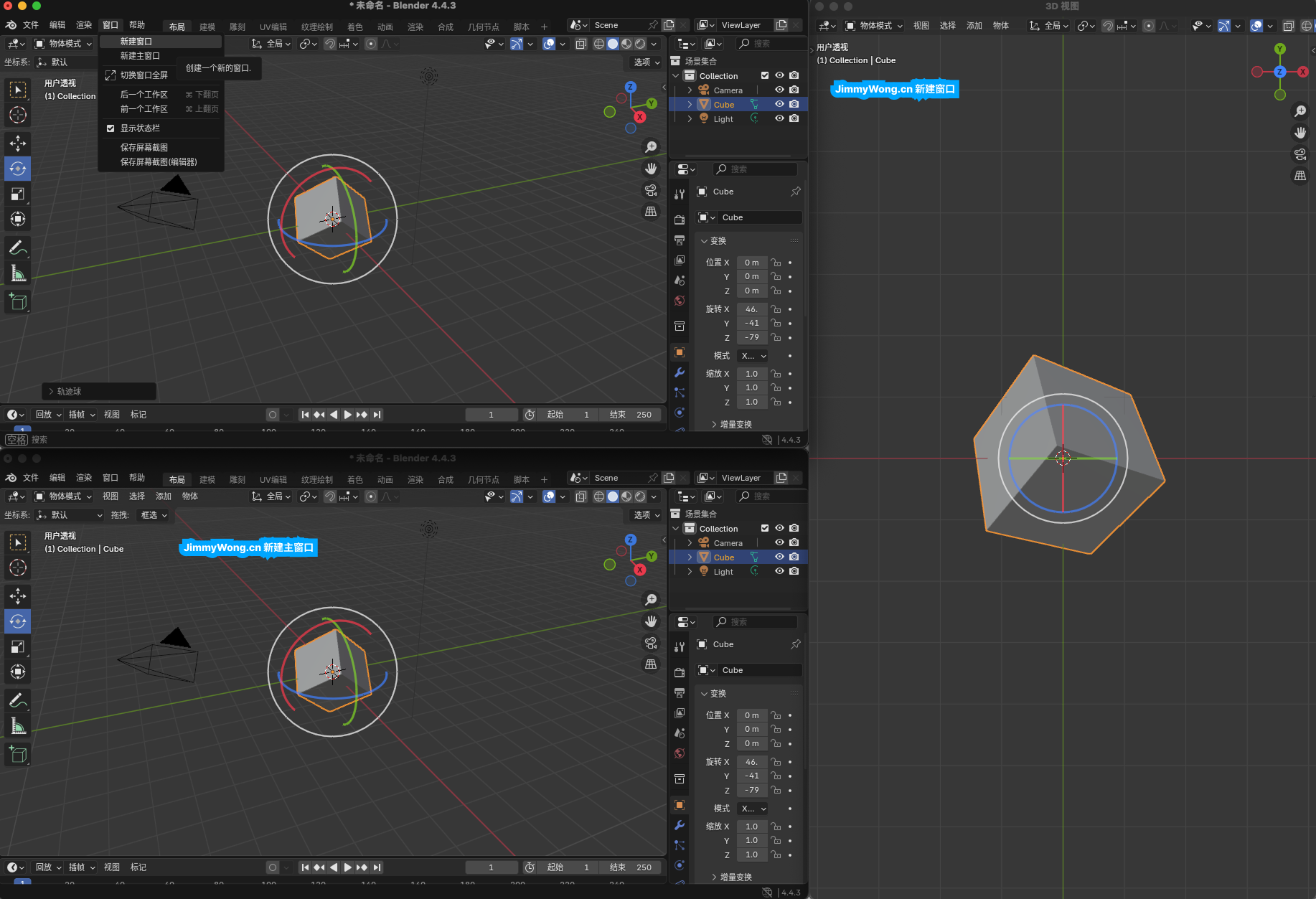 我们可以通过【新建窗口】【新建主窗口】来创建分屏,而内容均来自当前项目的内容,当操作当前项目的对象时,对应的【窗口】及【主窗口】也会同时变动,这就是Blender中的分屏,我们可以多个角度,效果去查看,跟踪模型的效果。可以多屏幕去操作同一个对象的创作,做到精细化的操作。