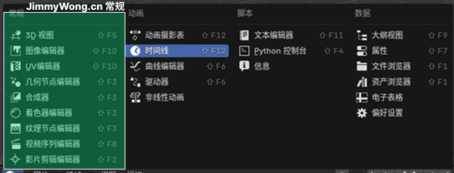 整个Blender的功能基本是围绕这个 图1-1展开的,【3D视图】就是整个的效果输出,是主窗口,其它所有内容,基本是为他服务的,就如我们所见的【常规】项【3D视图】以下都是编辑器,也就是编辑视图,最后也是结合到【3D视图显示】像【动画】【脚本】【数据】也是如此,我们使用时,可以根据需求去选择需要【区域】内容,也可以使用官方为我们提供的【布局】