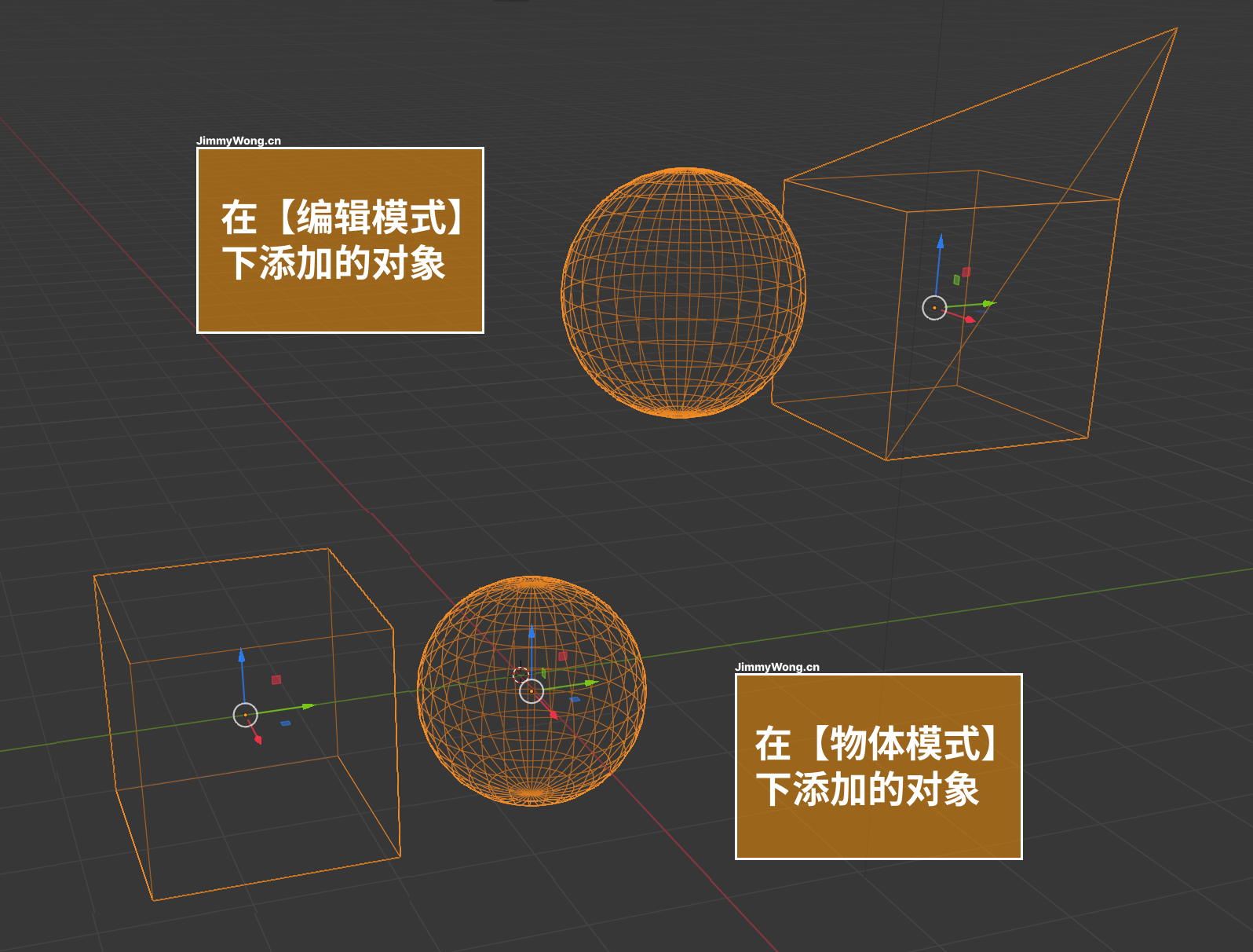 需要注意的是,在该模式下【添加】新的模型对象时,这个【对象】是独立的,而在【编辑模式】下,添加的对象是一体,