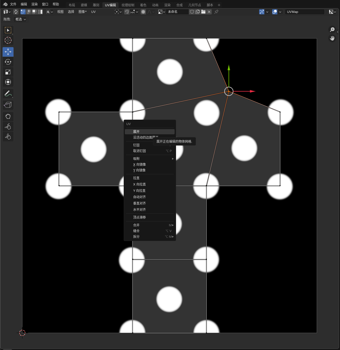 调整UV贴图时,我们可以通过【区域】的工具栏或是右击进行选择,常用的功能有【展开】【分割】【绽放】【移动】这些操作,【展开】是最便捷的操作。图 3.1.1.3-2
