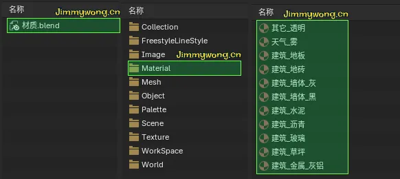 点击【关链】选择任意的一个【.blend】文件,就会弹出这个文件的列表内容,材质,集合,贴图等等,均可以【关链】关系起来,而在这里,我们将材质贴图,作为一个独立的文件来进行管理,这样所有需要质材的地方我们都能通过这个接口文件来进行统一管理修改调整,避免不必要的引用混乱。