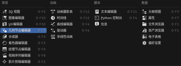 【几何节点编辑器】主要是可以通过一些【网格】【线条】【多边形】等等进行放样,比如【渔网】【栅栏】【公路】【高架桥】【桥】【建筑群】等等,都可以使用【几何节点】进行构造,在我们创建重复的内容时,是十分便捷的功能。 使用【几何节点时】我们需要在新建一个【区域】在区域中去创建我们需要的【几何节点】内容,或是直接在系统默认的布局中选择【几何节点】即可,