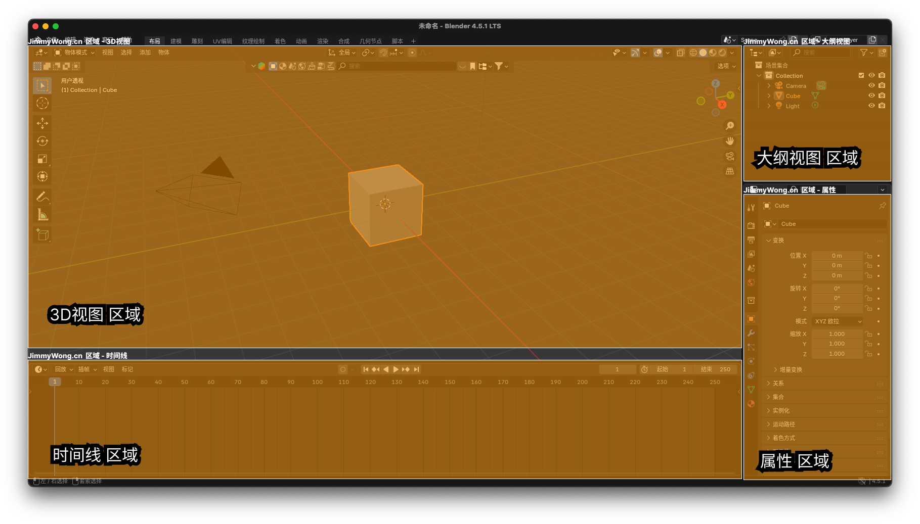 在图 2.1-2,中,我们将区域以黄色块来区分,这些分块的都统称为区域,在 Blender 一个功能面的【布局】是由【区域】构成的,每个【区域】可以根据自己的需要去调整或选择需要内容,其它我们只需要记住,【3D视图】是主窗口,同时可以划分其它【区域】来显示其它信息数据内容,来辅助【3D视图】模型的打造。