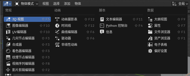分出【区域】块后,我们就可以通过左上角的图片,进行【区域】内容的选择,图 2.1-3,图列表的内容就是Blender的整体功能内容,【区域】就是通过这部份来展现的,