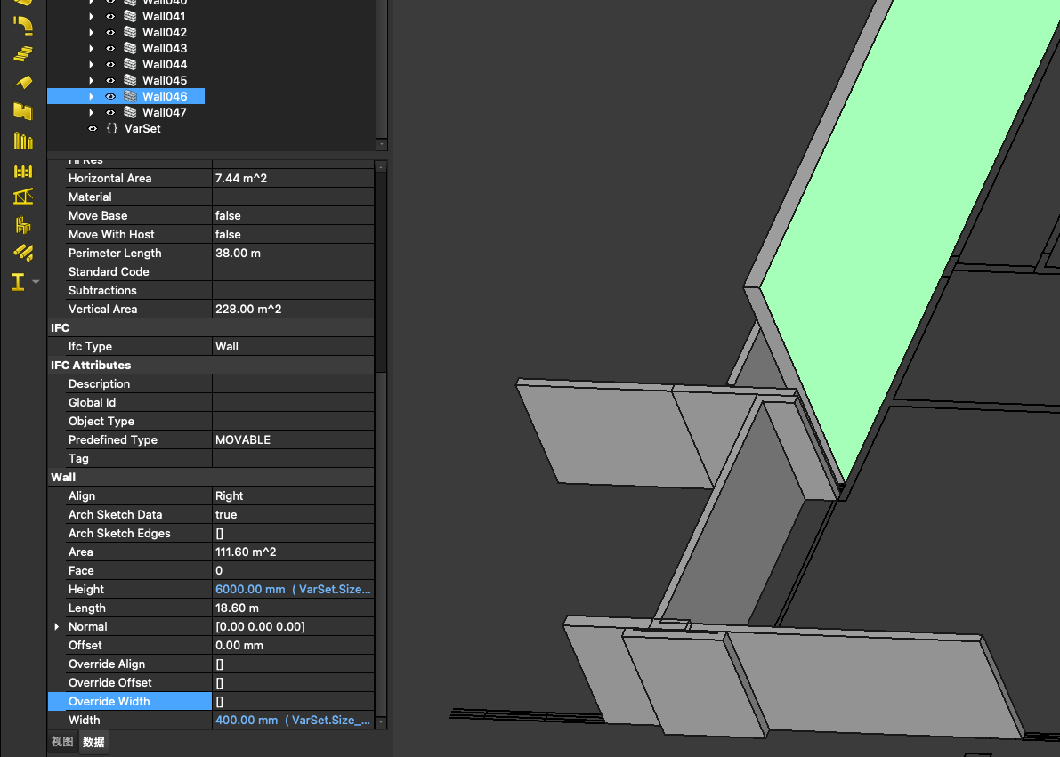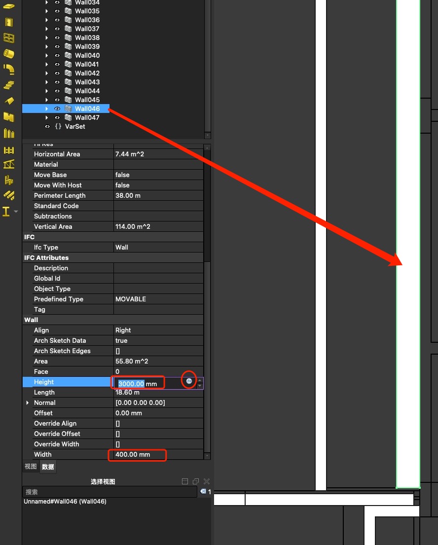 此时我们就可以看到墙体的高度已经是我们绑定的6米高度了,而且【厚度】同时也是绑定了【数据集】图 2.3-5