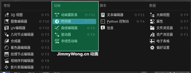 分出【区域】块后,我们就可以通过左上角的图片,进行【区域】内容的选择,图 2.1-3,图列表的内容就是Blender的整体功能内容,【区域】就是通过这部份来展现的,