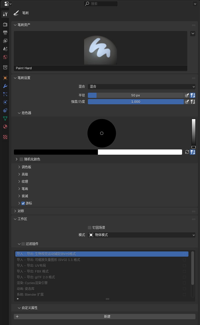 【导入/导出】一般导入是指.obj,.svg,.fbx等这种类型的文件可以选择【import/导入】的功能,一般来说这种格式都不会带有材质的,SVG主要是导入【二维平面】可以在Blender进行【三维实体】操作,OBJ,FBX这种一般为模式对象,也是不带材质内容的。glbt,gbl像这种格式一般都会带有贴图,灯光,等,因此一般【导出】使用比较推荐这种格式。