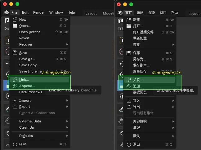 【关链/追加】和导入是两种不同的形式,是需要区分开来的,也可以理解为引入指提.blend这类的文件,而导入指.obj, .fbx, .gltf等格式的文件。【关链】也可以理解为一种文件链接,用过PS的用户也可以理解为【置入】当原始文件修改,【连接/置入】的文件也会跟着更新是一种极为方便的项目连接方式。【追加】就是直接把文件的内容复制到当前文档中。