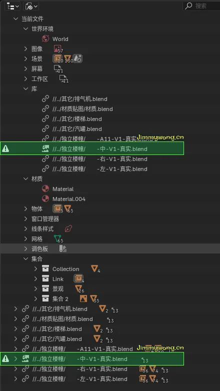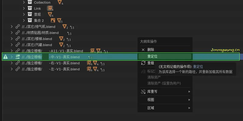 我们在【显示模式】下,选择【Blender文件 / Blender Files】这里,就可以看到我们【关链】了哪些文件,而哪些是正常的,哪些是异常的,如图1.2-10,文档断开了就表明这个链接找不到了,此时我们就需要重新导入一下链接文件