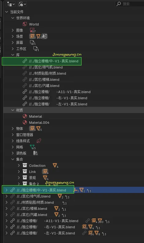 点击【关链】选择任意的一个【.blend】文件,就会弹出这个文件的列表内容,材质,集合,贴图等等,均可以【关链】关系起来,而在这里,我们将材质贴图,作为一个独立的文件来进行管理,这样所有需要质材的地方我们都能通过这个接口文件来进行统一管理修改调整,避免不必要的引用混乱。