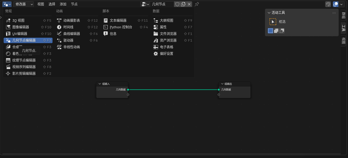 【几何节点编辑器】主要是可以通过一些【网格】【线条】【多边形】等等进行放样,比如【渔网】【栅栏】【公路】【高架桥】【桥】【建筑群】等等,都可以使用【几何节点】进行构造,在我们创建重复的内容时,是十分便捷的功能。 使用【几何节点时】我们需要在新建一个【区域】在区域中去创建我们需要的【几何节点】内容,或是直接在系统默认的布局中选择【几何节点】即可,