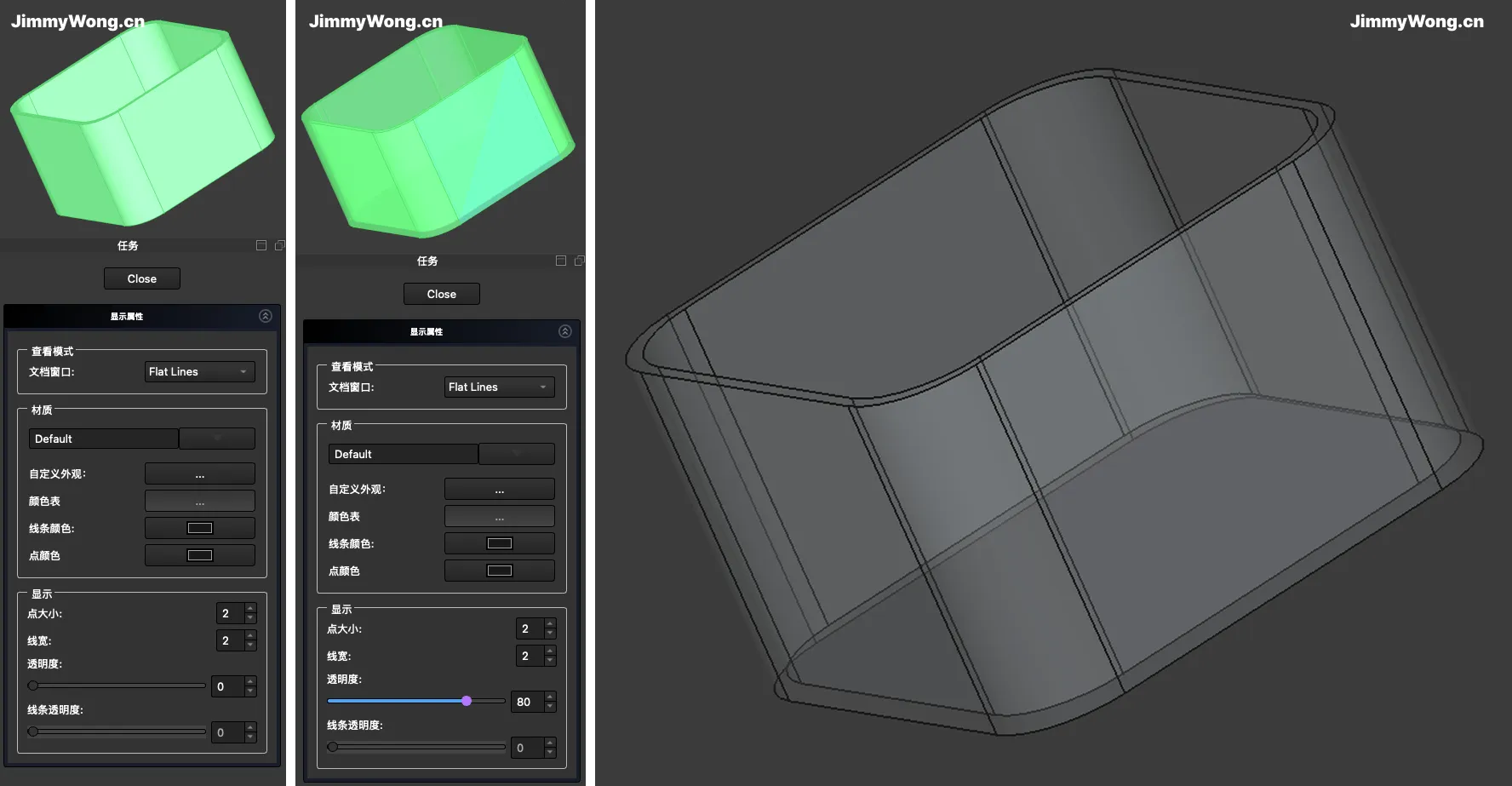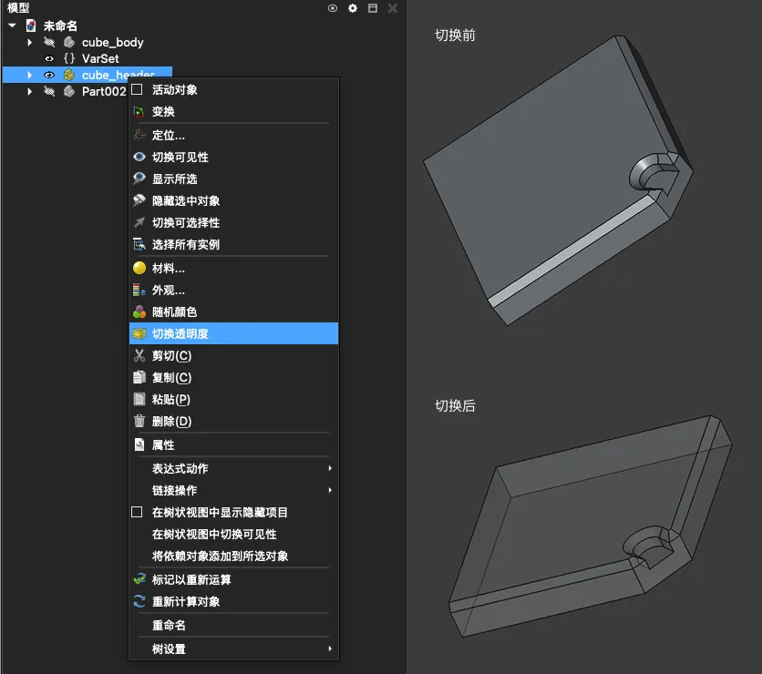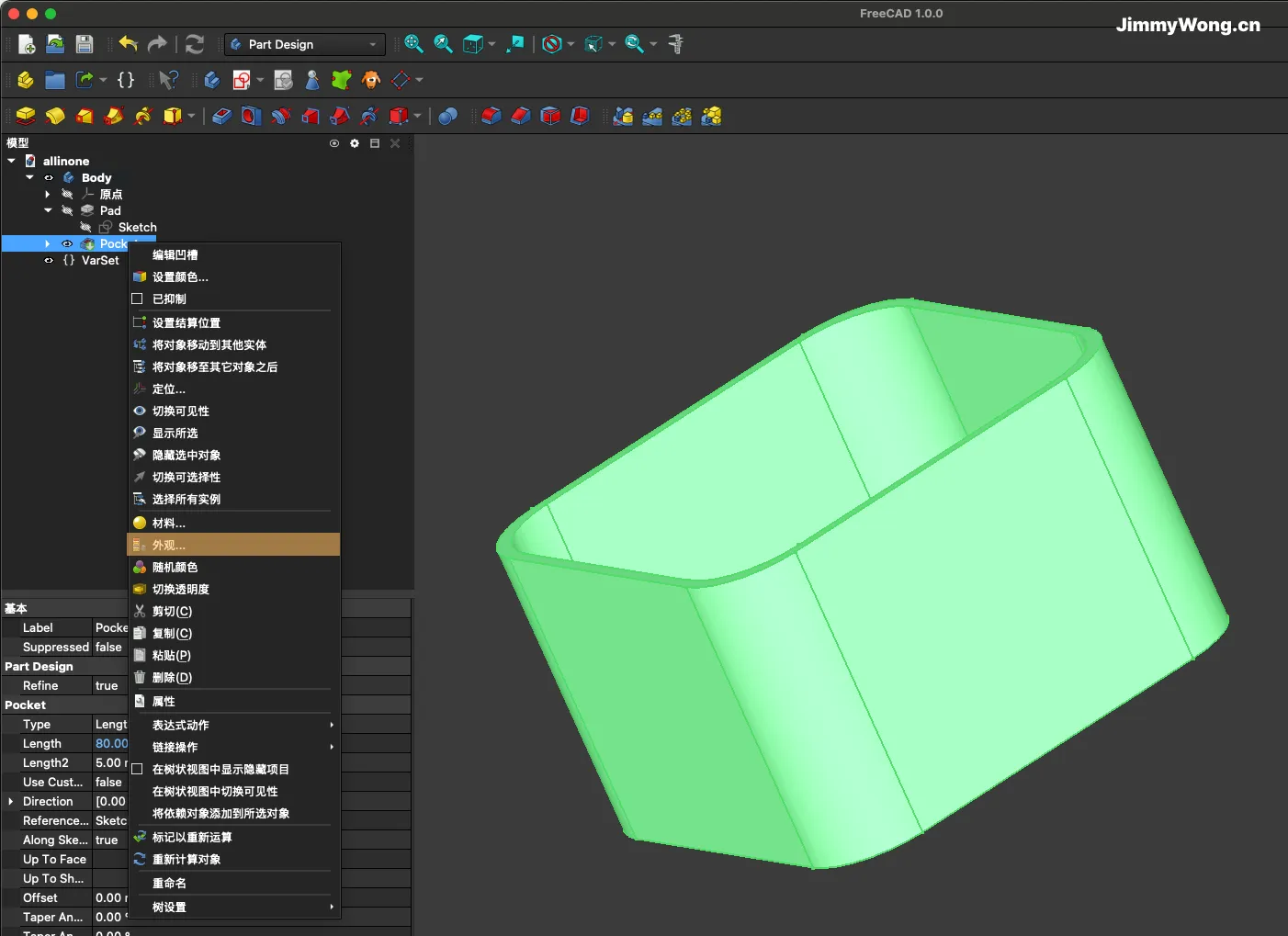 - 1,从模型列表 选中Pocket 右击弹出列表 选择 【外观】 图 1.2.3.1 进行调整,整体的透明强度。