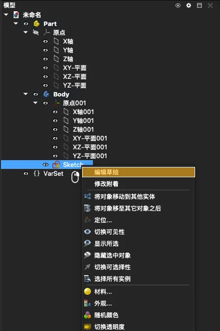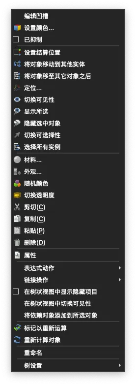 在【模型】列表中对选中的对象右击就可以弹出图 1.2.3-1 的列表内容,不同对象弹出的列表内容会有所差异。