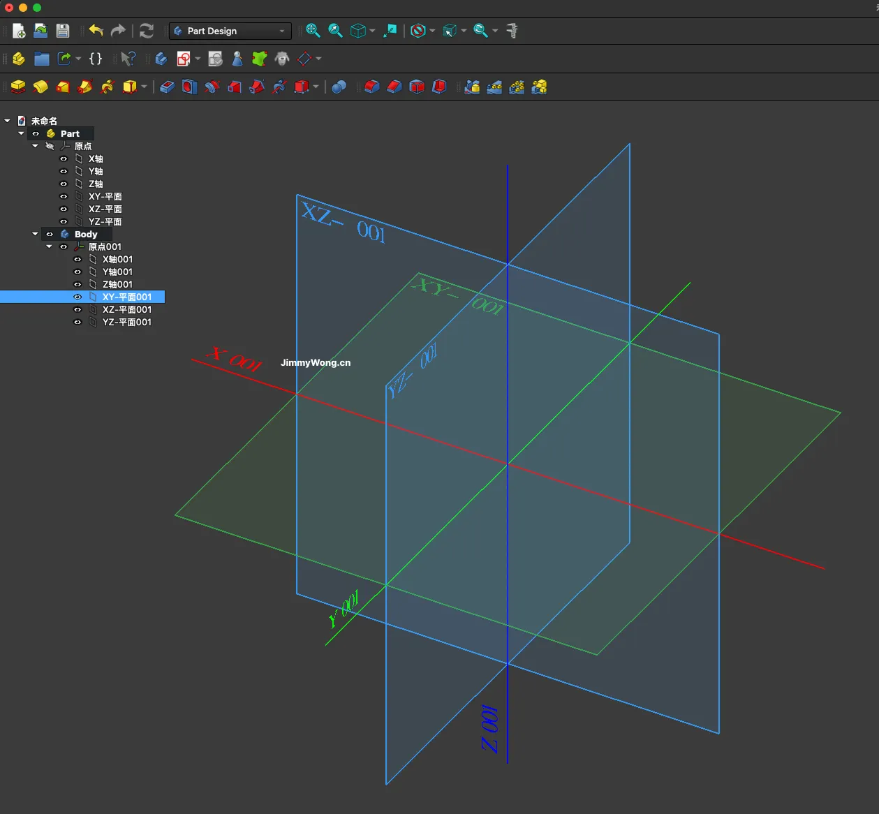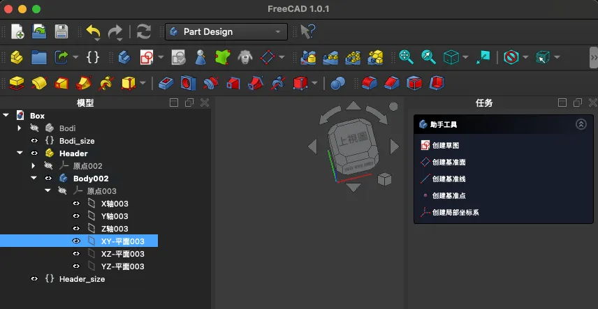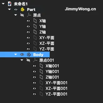 在这里,一个 Part/零件 也有自带点,线,面这些轴向的,这个主要是针对零件的整体,而 Body/实体的点,线,面,坐标轴,针对的是 Body/实体 的对应空间向量。