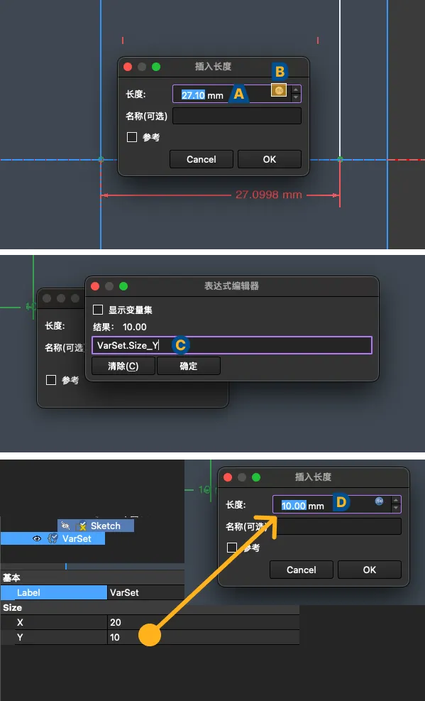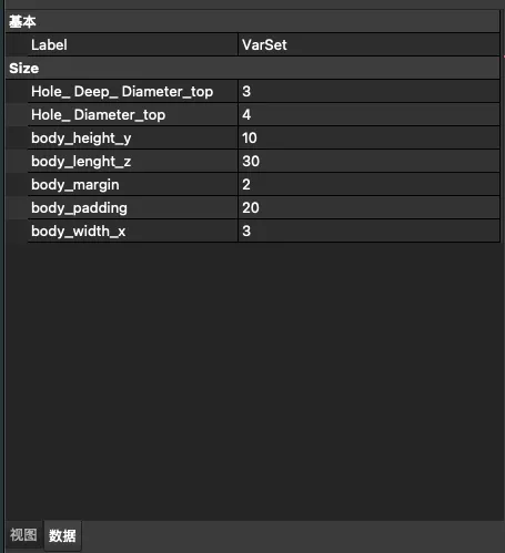 在每个变量集中,需定义与零件几何特征相关的基础尺寸数据,如: