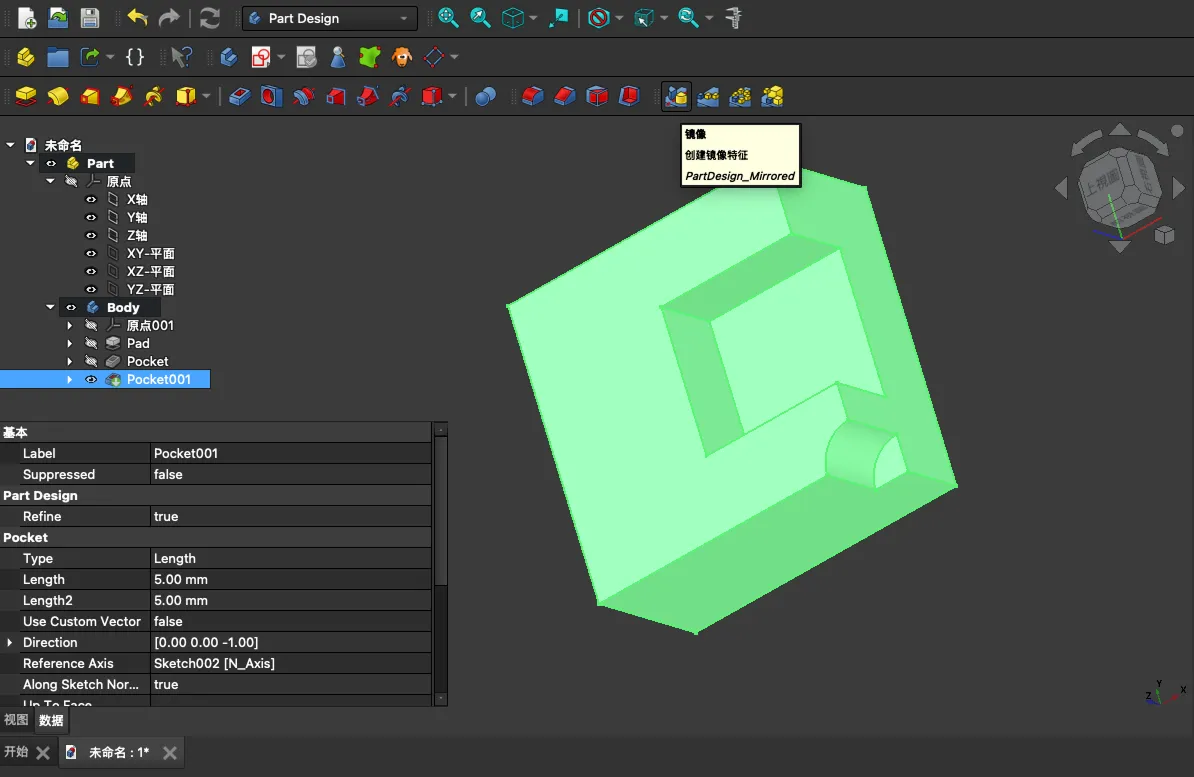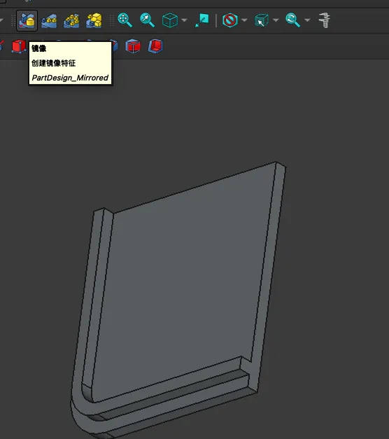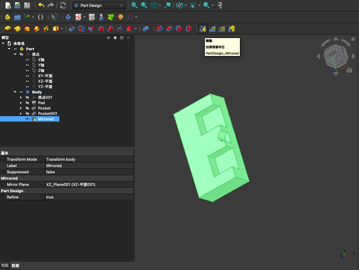 在这里,使用了选择引用选项,选择【选择引用】,然后点击引用的面,他便会基于这个面,进行镜像,平面会显示您选中的平面名称【Mirrored:Face4】如图 3.2.22.2-3