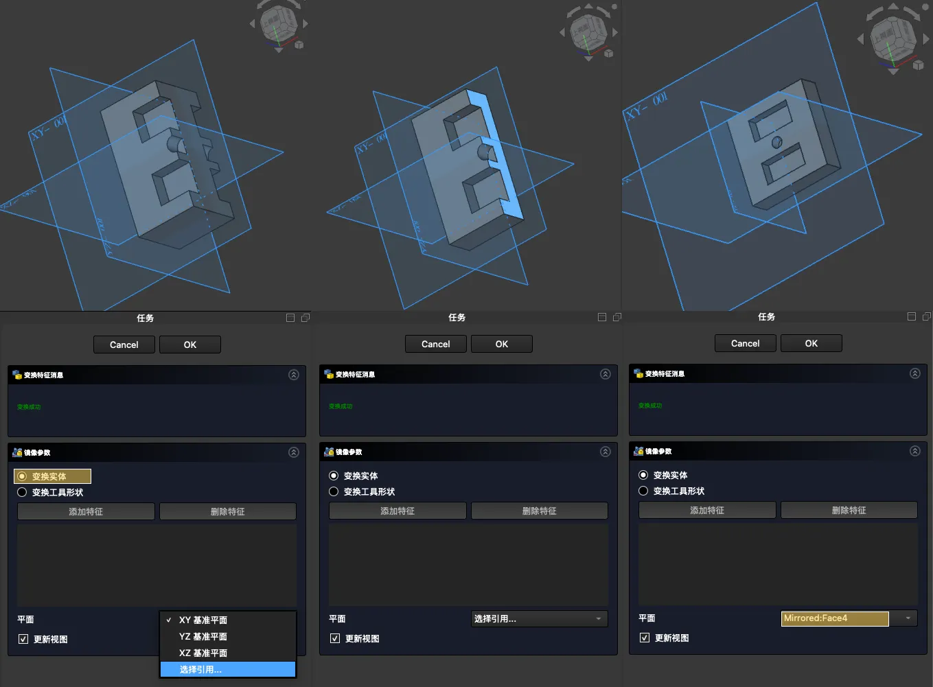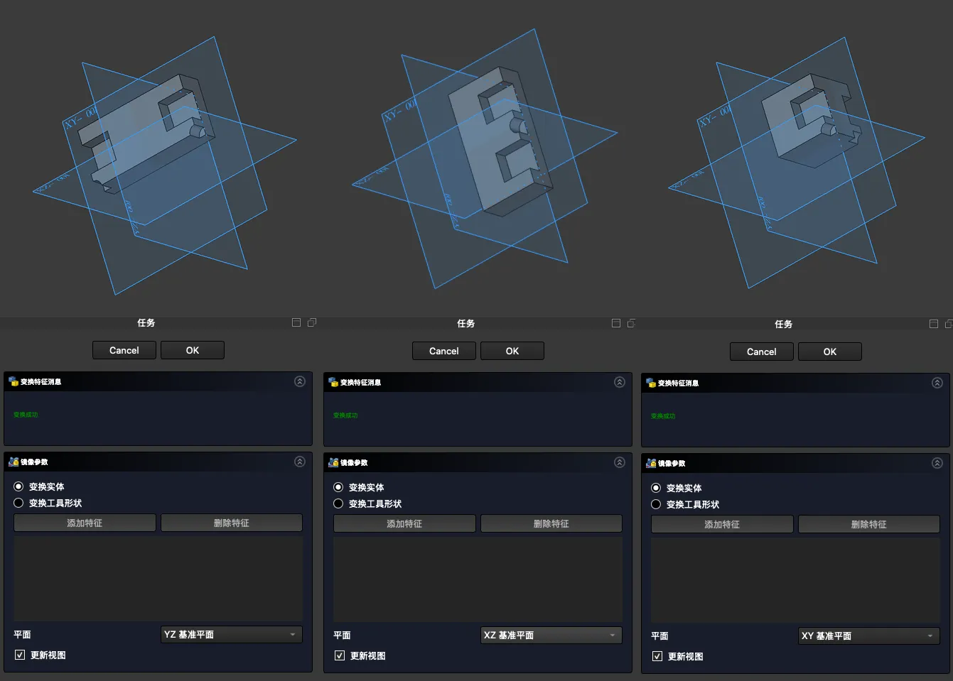 可以根据自己的需求,选择镜像的面或方向 图 3.2.22.1-3 分别示例了 每个基准面的效果