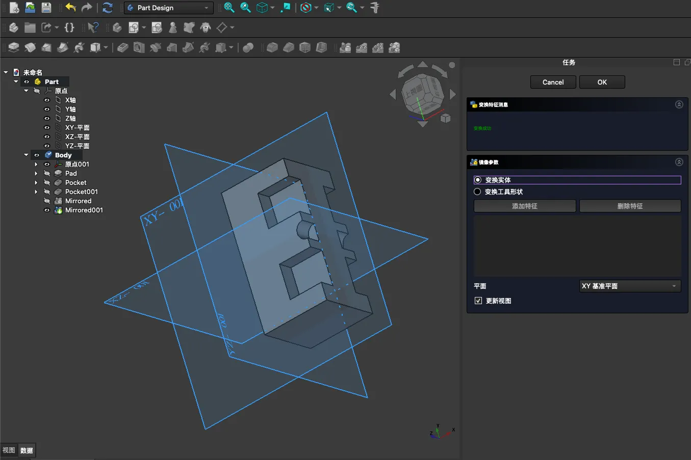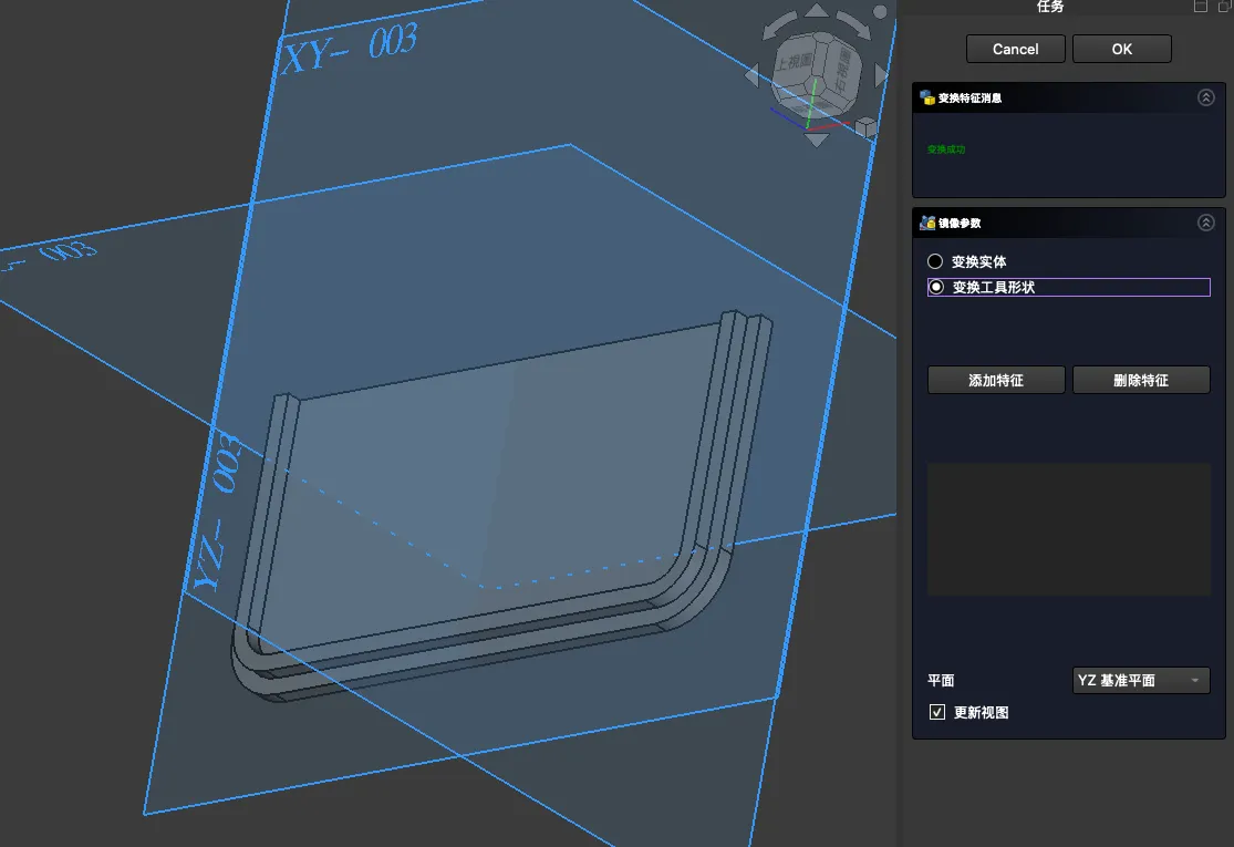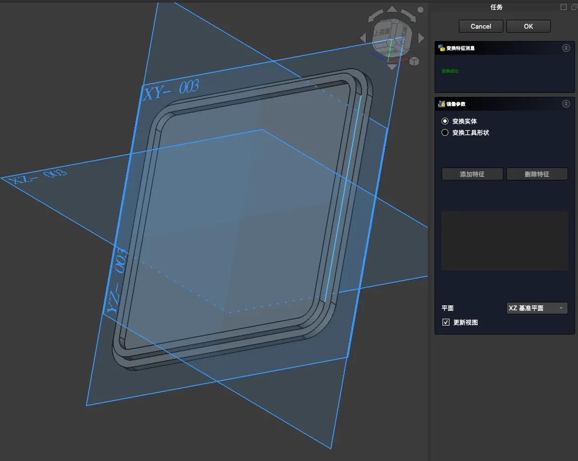 在任务列表里,【镜像参数】需要选择【变换实体】这一项,再去选择镜像的平面 图3.2.22.2-2