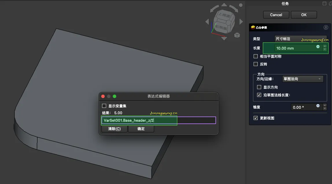 选中工具栏的厚度,或是右侧面板中的厚度按钮,默认厚茺为1mm,你可以通过修改厚度的值来改变整体的壁厚,或是输入表达式,来统一变量的尺寸,当我们在对异形进行多个挖空,需要,先将凹凸的地方先通过草图,零件,挤压绘制出来,然后,选择需要制作厚度的画,再点厚度按钮,实现异形面的厚度效果