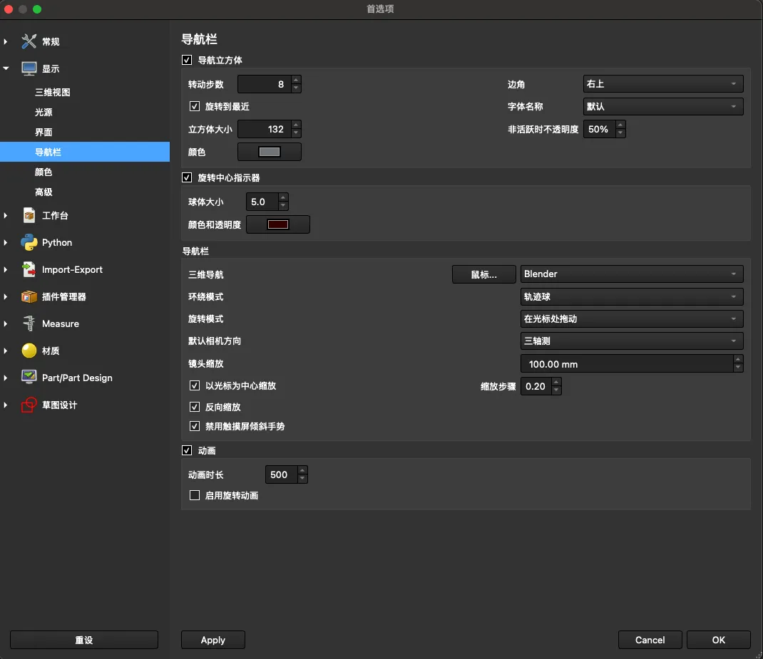 可以通过导航栏卡片,设置FreeCAD的操作模式,熟tC悉D操作的可以选择CAD,本人用Blender比较多,因此将【三维导航】的操作模式选择为【Blender】,根据个人偏好选择即可。图1.15
