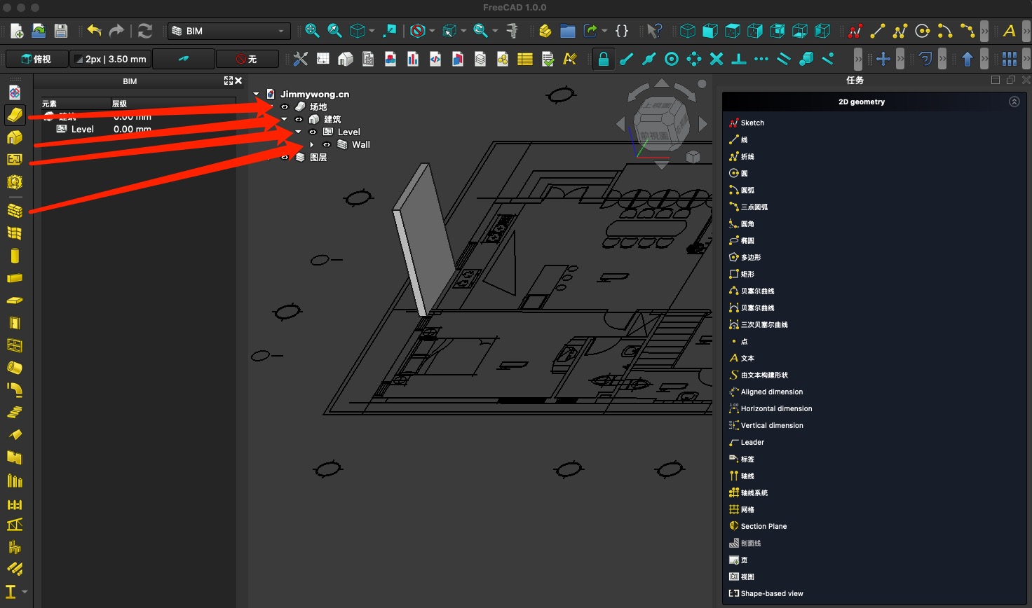 我们在制作FreCAD零件工作台时,通过一个实例来讲解如何使用Freecad的零件工和台和草图工作台以及说了一个最基本的装配工作台的使用,我们同样用一个实例来讲解BIM工作台该如何使用,BIM工作台其实就是建筑信息建模(Building Information Modeling),而这方面不会以一步一步来进行讲解,而是以一个分类来介绍如何使用BIM工作台的内容,经如墙,窗,柱子等等分类说明,不会像《FreeCAD基础技术应用》那么详细去写第一步步骤,因为零件工作台和草图工作台合并在一起了,BIM是一个合并的建工作台,不会像零件那样,去切换草图工作台,BIM的内容基本可以在这个工作台完成,因此主要在于分类功能使用讲解