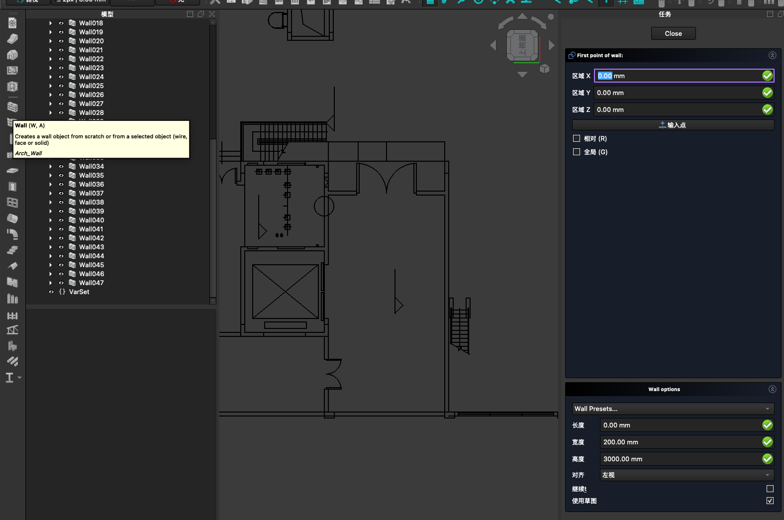 二,通线导入的DXF文件选择对应的线体,通过【墙】工作,生成临时墙体,再对墙体进行数据更改,